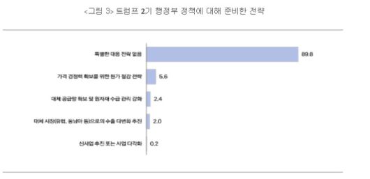 트럼프 2기 행정부 정책에 대해 준비한 전략에 대해서는 '특별한 대응 전략 없음'(89.8%)이 가장 높게 나타났다. ▲가격 경쟁력 확보를 위한 원가 절감 전략(5.6%) ▲대체 공급망 확보 및 원자재 수급 관리 강화(2.4%) 등의 소수 응답이 있었다.