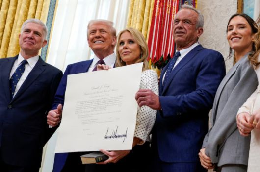 로버트 케네디 주니어 미 보건복지부장관이 13일 백악관에서 취임 선서 후 부인과 함께 임명장을 들어보이고 있다. [사진=로이터] |