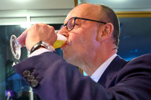 프리드리히 메르츠 기독민주당(CDU)·기독사회당(CSU) 연합 대표가 23일 총선에서 출구조사가 발표된 뒤 맥주를 들이키고 있다. 로이터 연합뉴스 |