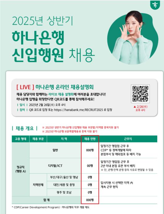 자세한 내용은 하나은행 채용 홈페이지(https://hanabank.recruiter.co.kr)에서 확인할 수 있다.