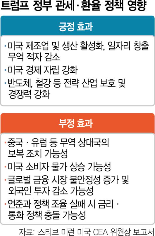 스티븐 미런 백악관 경제자문위원회(CEA) 위원장 지명자는 ‘글로벌 무역 시스템 재구조화를 위한 가이드’라는 보고서에서 “대규모 관세 도입과 강(强)달러 탈피 정책은 글로벌 무역·금융 시스템을 근본적으로 변화시킬 수 있다”면서도 “동맹국과 연방준비제도(Fed·연준)와의 협력을 통한 달러 정책 조율이나 점진적인 시행(gradual implementation) 전략이 필요하다”고 지적했다. 그는 “관세와 환율 정책을 한번에 급격히 시행할 경우 금융시장이 극심한 혼란을 겪을 가능성이 크다”며 “2~3년 정도 점진적으로 관세를 인상하는 전략을 통해 시장에 적응 시간을 주고 충격을 최소화해야 한다”고 강조했다.