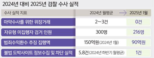 대표적으로 범죄자가 은닉한 범죄수익을 찾아내 환수한 ‘범죄수익환수 추징 집행액’은 올해 1월 90억원으로 전년 동기 150억원 대비 약 40% 감소했다. 징역·금고 등의 실형을 선고받았으나 도주한 자유형 미집행자 검거 인원도 지난해 월평균 300명에서 올 1월 216명으로 30% 가까이 줄었다. 불법 도박사이트 정보 수집 및 차단 실적도 지난해 하반기 월평균 5.8건에서 올 1월 기준 1건으로 감소했다.