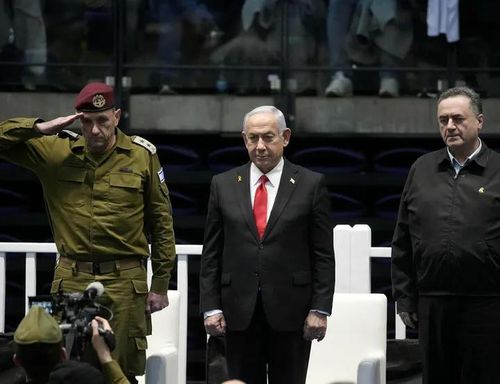 이스라엘군 사관학교 졸업식에 참석한 베냐민 네타냐후(가운데) 이스라엘 총리 |