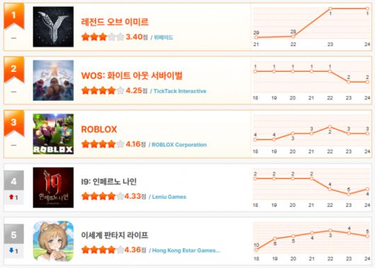 2주째 굳건히 왕좌를 지켜온 'WOS: 화이트 아웃 서바이벌'과 방학 때면 뜨는 '로블록스', 2025년 흥행 MMORPG 'I9:인페르노 나인' 등 상위권 게임들은 '레전드 오브 이미르'의 등장으로 일제히 하락했다.