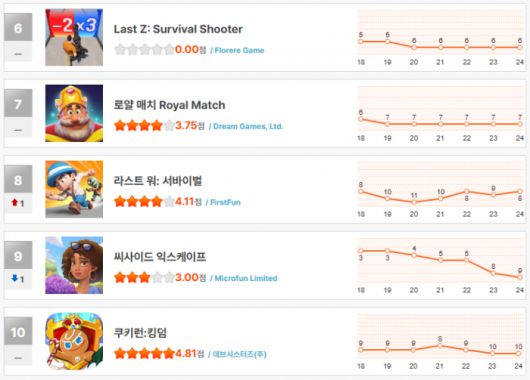 시간 때우기 머지 게임으로 주목받았던 '씨사이드 익스케이프'는 큰 폭으로 하락해 9위에 랭크됐으며, 4주년을 맞은 '쿠키런: 킹덤'은 업데이트로 Top10 진입은 성공했지만 더 이상의 상승세를 타지는 못하는 상태다.