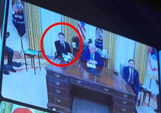 영상에서 트럼프 대통령은 본래 자신의 자리에 앉아있지만, 마크롱 대통령은 책상 모서리 부분에 끼인 듯 앉아있는 모습을 볼 수 있다. 반대편에는 JD 밴스 미국 부통령이 역시 본래 자리가 아닌 모서리 옆쪽에 앉아있었다.