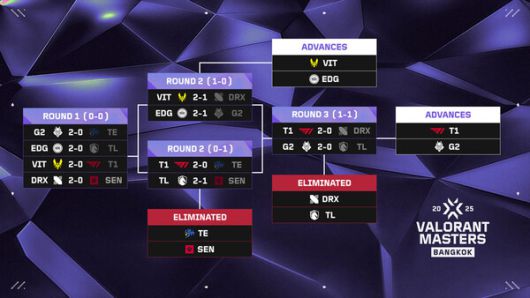 라이엇 게임즈는 20일부터 24일까지 태국 방콕 UOB 라이브에서 열린 발로란트 마스터스 방콕 스위스 스테이지 결과를 전했다. T1이 DRX와의 천적 관계를 끊어내고 플레이오프 티켓을 손에 넣었다.