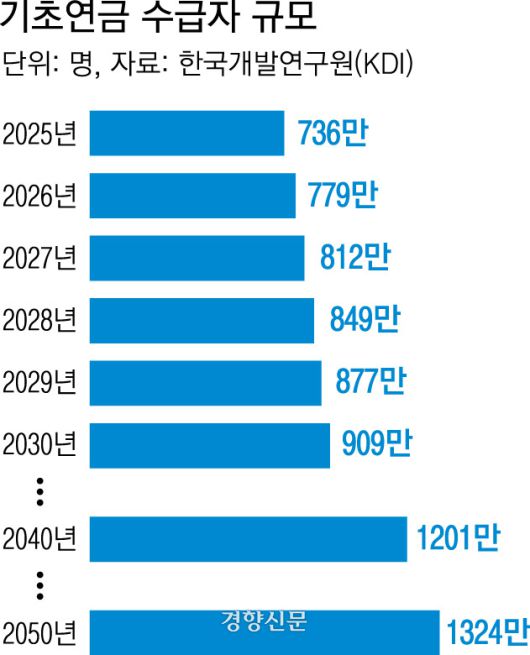 KDI는 현행 기준을 유지하면 기초연금 수급자가 올해 736만명에서 2050년 1324만명으로 늘어나고, 기초연금 지출액이 2014년 6조8000억원에서 2023년 22조6000억원, 올해 27조원, 2050년 46조원 등으로 증가할 것이라고 전망했다. 기초연금 지출 규모는 현재 정부가 시행 중인 복지 사업 중 가장 크다.