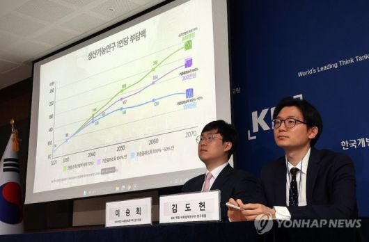 한국개발연구원(KDI) 이승희(왼쪽), 김도헌 연구위원이 25일 정부세종청사에서 KDI FOCUS ‘기초연금 선정방식 개편방향’을 발표하고 있다. 연합뉴스 |