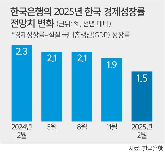 한은 금융통화위원회는 이날 통화정책방향 회의를 열고 올해 경제성장률을 지난해 11월 전망치보다 0.4%포인트 낮춘 1.5%로 제시했다. 이 같은 대폭 하향 조정에 대비해 한은은 지난 1월 이례적으로 올해 성장률을 1.6∼1.7%로 낮출 것이라고 예고했다. 그러나 불과 한 달 새 0.1∼0.2%포인트나 더 떨어진 것이다. 이 총재는 “1월에는 비상계엄 사태 등 국내상황이 주요한 요인이었는데, 이후 도널드 트럼프 미 대통령이 취임하고 미국 관세정책 등 불확실성이 더 커졌기 때문”이라고 설명했다.