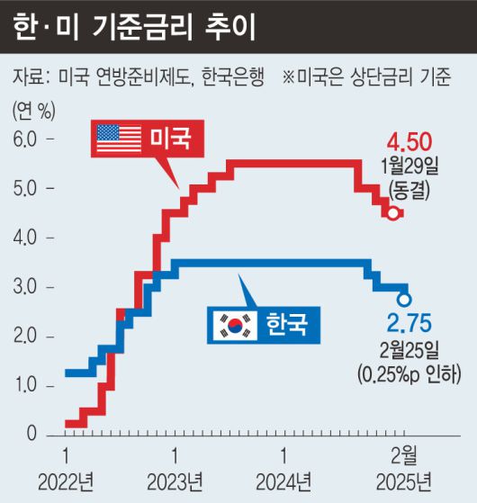 한국은행이 기준금리를 인하(연 3.00%→연 2.75%)로 내린 건 물가와 가계부채의 안정 속에 경기 불안이 상대적으로 더 크다고 봐서다. 다만 올해 상반기에 한 차례 더 금리를 내릴지 여부는 불투명하다. 금통위원 간 견해가 팽팽히 엇갈렸기 때문이다. 환율 안정세 유지와 더불어 정부의 추가경정예산 편성 여부가 추가 금리 인하의 가늠자다.