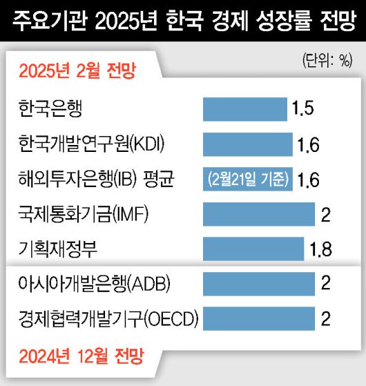 한은이 25일 발표한 ‘통화정책방향 결정문’(통방문)과 ‘수정 경제전망’에는 올해 한국 경제를 바라보는 한은과 금통위원들의 어두운 시각이 고스란히 담겨 있다. 통방문은 “앞으로 국내 경제는 경제 심리 위축, 미국의 관세 정책 등의 영향으로 내수 회복세와 수출 증가세가 당초 예상보다 낮을 것으로 예상된다”고 밝혔다. 지난해 12월 비상계엄과 도널드 트럼프 미국 행정부의 관세 정책이 올해 성장률 전망을 석달 전보다 0.4%포인트 내려 잡은 핵심 이유라는 뜻이다. 이창용 한은 총재는 “(변경된 성장률 전망에는) 트럼프 정부의 철강·알루미늄 관세 25% 부과 영향이 반영돼 있다”고 말했다.