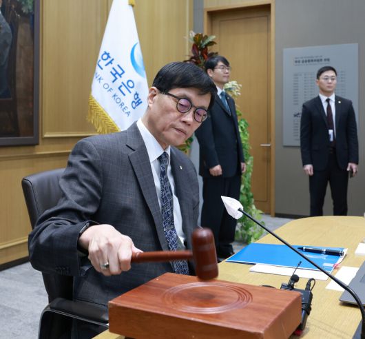 이창용 한국은행 총재가 25일 한은에서 열린 금융통화위원회에서 의사봉을 두드리고 있다. 한은 제공 |