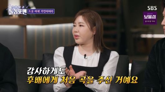 이날 방송에서 송가인은 신곡 ‘눈물이 난다’를 언급하며 심수봉에게 선물받은 곡이라고 전했다. 송가인은 “감사하게도 후배에게 처음 곡을 주신 거다”라며 작곡료도 받지 않았다고 덧붙이며 놀라움을 자아냈다.