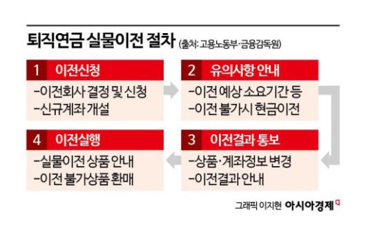 A. 퇴직연금 실물이전(갈아타기) 서비스를 통해 가능하다. 새롭게 계좌를 옮기고자 하는 퇴직연금 사업자(은행·보험·증권사)에서 퇴직연금 계좌를 개설하고 이전신청서를 제출하면 된다. 현재는 동일한 제도 내에서만 이전이 가능하다. 예를 들어 IRP형에서 다른 IRP형으로만 이전할 수 있다. DC와 IRP는 적립금의 전부 이전만 가능하다. 계약 내 실물이전이 불가능하다면 현금화해 이전해야 한다. 실물이전이 가능한 상품은 예금, ELB, 펀드, ETF 등이다. 리츠, 머니마켓펀드(MMF), 주가연계증권(ELS)은 불가능하다.