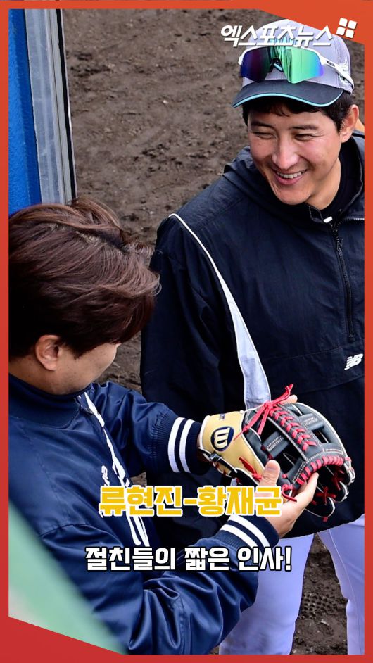 (엑스포츠뉴스 오키나와(일본), 김한준 기자) 26일 오후 일본 오키나와 고친다 구장에서 열리는 KT 위즈와 한화 이글스의 연습경기, 한화 류현진과 KT 황재균이 인사를 나누고 있다.김한준 기자 kowel@xportsnews.com