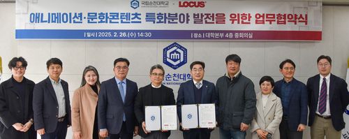 (순천=연합뉴스) 손상원 기자 = 국립 순천대학교는 26일 대학본부에서 문화콘텐츠 기업 로커스(LOCUS)와 애니메이션·문화콘텐츠 특화 분야 업무협약을 체결했다.