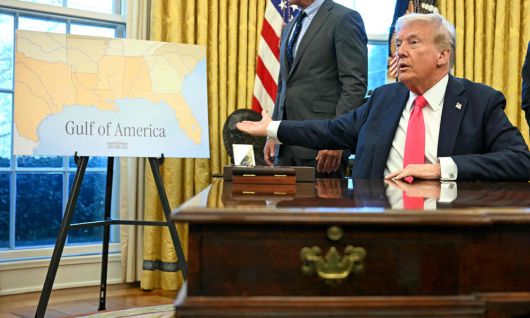 '미국만' 변경 과시하는 트럼프 도널드 트럼프 미국 대통령이 25일(현지시간) 백악관에서 기자들과 만나 '미국만'으로 변경된 지도를 가리키고 있다. 백악관은 '멕시코만' 표기를 '미국만'으로 바꾼 트럼프 대통령의 행정명령을 따르지 않은 AP통신에 최근 취재 제한 조치를 내렸다. AP통신은 법원에 가처분 신청을 제기했으나 24일 법원은 이를 기각했다. AFP연합뉴스 |