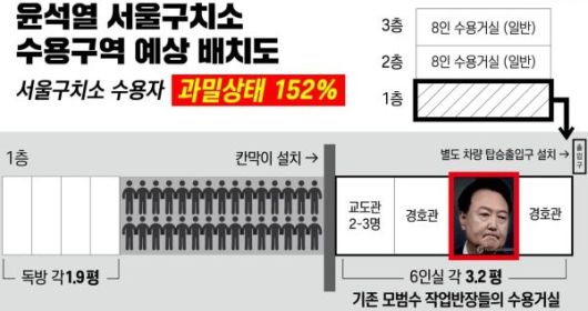 그러면서 “4개의 거실 중 한 곳을 윤 대통령이 쓰고 경호관들이 두 곳을, 교도관들이 나머지 한 곳을 쓰는 것으로 추정된다”며 ‘윤 대통령 수용구역 예상 배치도’를 제시했다.