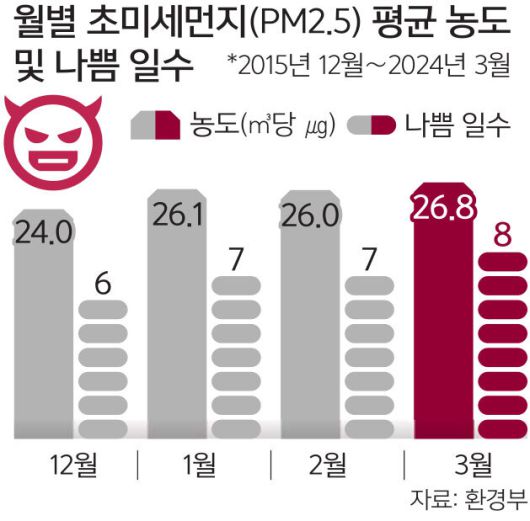 초봄이 되면 고기압이 한반도에 머물면서 기류가 안정돼 국내에서 배출된 미세먼지가 계속 쌓이고 국내에 유입된 국외 미세먼지도 잘 빠져나가지 않는 경향을 보인다. 실제 2015년부터 지난해까지 평균 월별 초미세먼지 농도를 보면 12월 ㎥당 24.0㎍, 1월 ㎥당 26.1㎍, 2월 ㎥당 26.0㎍, 3월 ㎥당 26.8㎍ 등이다.