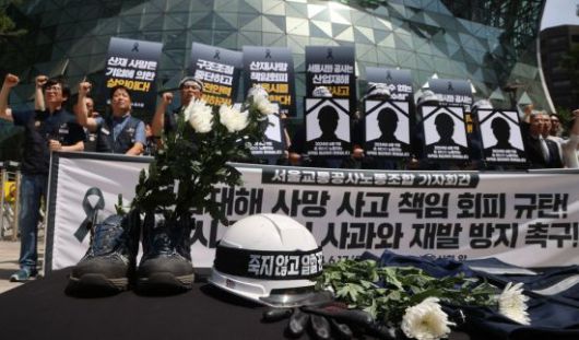 서울교통공사 노동조합이 지난해 6월 17일 서울시청 앞에서 기자회견을 열고 같은 달 9일 3호선 연신내역 전기실에서 직원이 작업 중 감전돼 사망한 사고와 관련해 서울시와 공사의 사과와 엄정한 사고 원인 규명을 촉구하고 있다. 연합뉴스 |