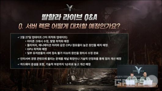 A 현재 발할라 인터서버와 특정 지역에서 서버 렉, 멈춤 현상이 발생하고 있다. 이와 관련하여 2월 27일에 업데이트를 통해 개선할 예정이다. 인터서버 경쟁 콘텐츠에 몰리는 문제를 채녈확장이나 기술적인 안정화를 통해 개선해 나갈 예정이다. 하드웨어 증설과 기술적 부분까지 1순위로 놓고 개선할 것이다.