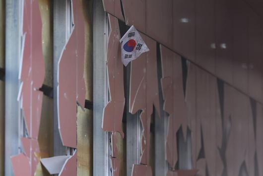 1월 19일 새벽 윤석열 대통령에 대한 구속영장 발부에 항의해 지지자들이 서울서부지방법원에 난입하는 사태가 벌어졌다. 법원 청사의 외벽과 유리창이 파손된 가운데 시위대가 깨어진 벽면 틈새에 태극기를 꽂은 모습. 뉴시스 |