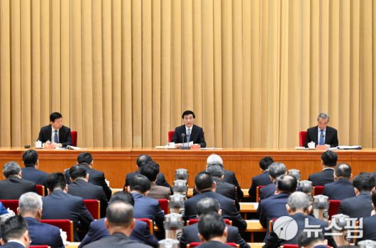 왕후닝 정협 주석(가운데)이 26일 베이징에서 진행된 대만 공작 회의에서 발언을 하고 있다. 회의에는 왕이 정치국위원(오른쪽)과 쑹타오 대외연락부장이 참석했다. [신화사=뉴스핌 특약] |