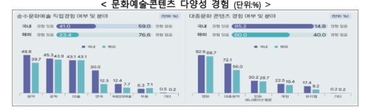 문화예술․콘텐츠의 다양성과 관련해 국내외 문화예술에 대한 직접 경험 여부를 살펴본 결과, 순수예술과 대중문화 모두 국내 콘텐츠보다 해외 콘텐츠를 접한 경험이 적은 것으로 나타났다. 분야별로 살펴보면 순수예술인 음악과 대중음악에서는 국내 콘텐츠 경험이 많았으며 문학, 미술 및 영화, 만화․애니메이션․웹툰 분야에서는 국내 콘텐츠를 접한 경험과 해외 콘텐츠를 접한 경험 정도가 비슷한 것으로 조사됐다.