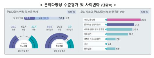 조사 결과, 우리나라 국민의 27.3%는 문화다양성에 대해 잘 알고 있는 것으로 나타났다. 우리 사회의 문화다양성 수준은 50.8점(100점 만점 기준)으로 평가했으며 5년 후 문화다양성 수준은 65.9점으로 다소 높아질 것으로 전망했다. 우리 사회의 문화다양성이 높아지면 사회갈등 완화(26.9%), 문화예술 경쟁력 강화(21.8%), 사회구성원 삶의 질 향상(20.3%) 등에 기여할 것으로 내다봤다.