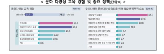 문화다양성 관련 교육을 받은 경험은 전체 평균 21.7%였으며, 15~19세가 68%로 가장 높았고 연령이 많을수록 그 경험이 적어지는 것으로 나타났다. 교육 내용으로는 인권(56.8%)이 가장 많았으며, 다음으로는 장애인식 개선(55.5%), 문화다양성(43.8%), 다문화 수용성(24.2%) 등의 순으로 조사됐다. 문화다양성 증진을 위해 가장 중요한 정책으로는 교육 및 인식 제고(30.1%)가 가장 필요하다고 꼽았으며, 법과 제도 정비(22.8%), 문화다양성 프로그램 및 행사 확대(20.8%)가 그 뒤를 이었다.