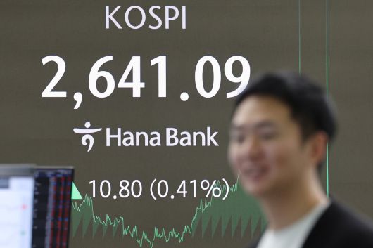 전날(26일) 오후 서울 중구 하나은행 본점 딜링룸 전광판에 코스피 지수가 표시되고 있다. /뉴스1 |