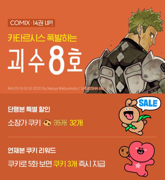 네이버시리즈는 '괴수 8호' 14권 공개를 기념해 이날부터 3월 17일까지 2주간 단행본 소장가를 할인하고 디지털 유료 연재본 5화 감상 시 쿠키 3개를 즉시 지급하는 이벤트를 진행한다.