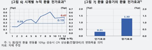 이는 기존에 환율이 10% 오르면 1년에 걸쳐 소비자물가를 약 0.2∼0.3% 밀어 올리는 것으로 알려진 것보다 더 큰 영향이 나타난 것이다.