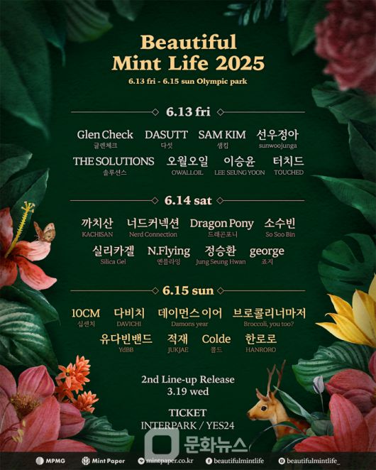 6월 13일부터 15일까지 3일간 송파구 올림픽공원의 3개 스테이지에서 진행되는 '뷰티풀 민트 라이프 2025(Beautiful Mint Life 2025)'의 공식 티켓은 3월 5일부터 인터파크,YES24를 통해 예매할 수 있으며, 2차 라인업은 오는 3월 19일 공개 될 예정이다.
