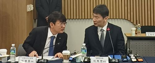 이복현 금감원장(오른쪽)이 이영종 신한라이프생명보험 대표이사와 27일 간담회에서 대화하고 있다. 문채석 기자 |