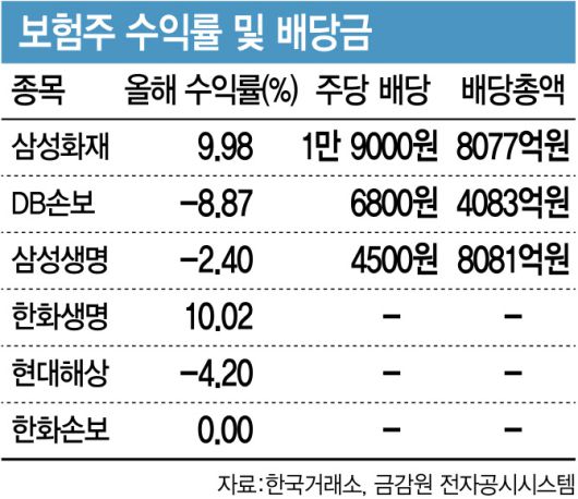 삼성화재와 삼성생명은 각각 주당 1만 9000원과 주당 4500원의 배당액을 발표했고 DB손해보험은 주당 6800원을 지급하기로 했다. 자사주 소각 등 밸류업(기업가치제고) 계획을 발표한 삼성화재는 연초 이후 주가가 9%대 상승했으나 삼성생명과 DB손해보험은 배당금 발표에도 주가가 각각 2%, 8% 이상 빠졌다.