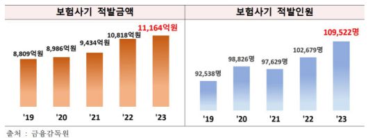 27일 보험업계에 따르면 지난 2023년 보험사기 적발금액은 1조 1164억원으로 전년대비 346억 증가했다. 보험사기로 적발된 인원은 10만 9522명으로 1년 새 6843명 증가해 역대 최고 수준을 기록했다. 보험사기 유형별로는 사고내용 조작이 59.3%로 가장 많았고 허위사고(19%), 고의사고(14.3%)가 뒤를 이었다. 최근에는 60대 이상의 고령층 보험사기 비중이 20%를 넘어가는 등 가파르게 증가하고 있다.