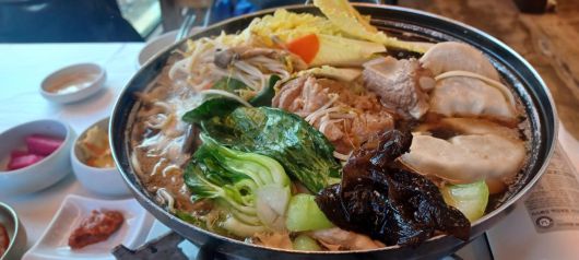 전북 정읍의 터줏대감으로 자리 잡은 이화담의 대표 메뉴 중 하나인 ‘생갈비만두전골’. 채소와 양지를 함께 우려낸 육수와 신선한 돼지갈비의 조화가 특색이 있다. 김도언 소설가 제공 |
