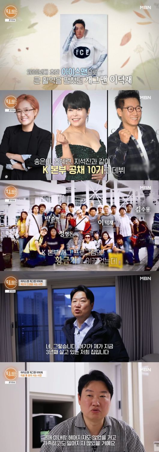이덕재는 2000년대 초반 '아이스맨'으로 활약한 개그맨으로 송은이, 조혜련, 지석진과 함께 K 본부 공채 10기로 개그 프로그램 전성기를 이끌었다. 황금기 시절에는 하루에 500만 원을 벌기도 하고, 일주일에 2000만 원까지 벌었다고.