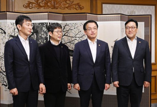 최상목 대통령 권한대행이 28일 서울 종로구 정부서울청사에서 열린 \'거시경제.금융현안 간담회\' 시작에 앞서 참석자들과 기념촬영을 하고 있다. 왼쪽부터 이복현 금감원장, 유상대 한국은행 부총재, 최상목 대통령 권한대행 부총리, 김병환 금융위원장. 기획재정부 제공 |
