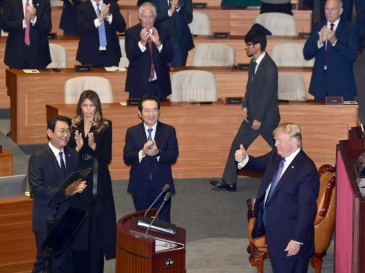 도널드 트럼프 미국 대통령이 2017년 11월 8일 오전 서울 여의도 국회 본회의장에서 1993년 7월 빌 클린턴 대통령 이후 24년 만에 국회 연설을 마친 뒤 기립해 박수를 치는 한국 국회의원들을 향해 엄지를 들어올리며 화답하고 있다./조선일보DB |