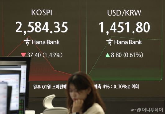[서울=뉴시스] 김명년 기자 = 코스피가 전 거래일(2621.75)보다 36.14포인트(1.38%) 내린 2585.61에 개장한 28일 오전 서울 중구 하나은행 딜링룸에서 딜러들이 업무를 보고 있다. 코스닥 지수는 전 거래일(770.85)보다 10.75포인트(1.39%) 하락한 760.10에 거래를 시작했다. 원·달러 환율은 전 거래일 주간거래 종가(1443.0원)보다 8.0원 오른 1451.0원에 출발했다. 2025.02.28. kmn@newsis.com /사진=김명년 |