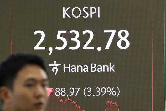 28일 한국거래소에 따르면 이날 코스피는 전일 대비 3.39% 하락한 2532.78에 거래를 마쳤다. 매도세는 외국인과 기관이 주도했다. 이날 외국인과 기관은 각각 1조5580억원, 6179억원 어치를 순매도 했다. 개인은 홀로 2조357억원 어치를 사들였지만, 증시를 떠받치기에는 역부족이었다.