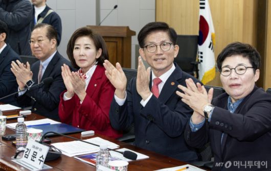 김문수 고용노동부 장관이 19일 오전 서울 여의도 국회 의원회관에서 열린 '2030·장년 모두 Win-Win하는 노동개혁' 대토론회에서 내빈 소개때 박수를 치고 있다. 2025.2.19/사진=뉴스1 /사진=(서울=뉴스1) 이재명 기자 |
