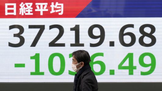 ▲ 28일 도쿄의 한 증권사에서 한 사람이 일본 닛케이 지수가 표시된 전자 주식판 앞을 걷고 있다.