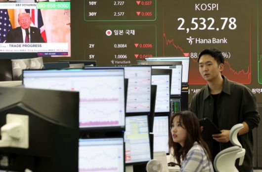 (서울=뉴스1) 이동해 기자 = 국내 증시가 급락세를 보인 28일 서울 중구 하나은행 본점 딜링룸 전광판에 종가와 미국 트럼프 대통령 관련 뉴스가 송출되고 있다. 이날 코스피 지수는 전 거래일 대비 88.97포인트(p)(3.39%) 하락한 2532.78, 코스닥 지수는 26.89p(3.49%) 하락한 743.96, 달러·원 환율은 20.4원 오른 1463.4원으로 장을 마감했다. 2025.2.28 |