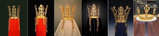 신라 금관들. 왼쪽 사진부터 금관총, 황남대총 북분, 천마총, 서봉총, 금령총 출토 금관과 경주 교동 금관. 국가유산청 제공 |