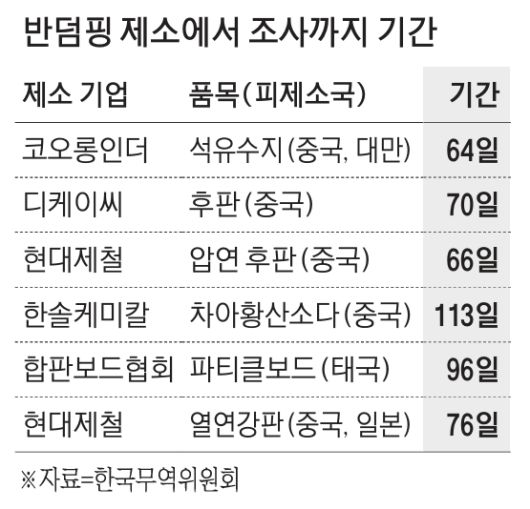 산업계에서는 정부의 더딘 무역구제 조사에도 불만을 내비치고 있다. 기업들이 무역구제 조사 신청을 하면 통상 2개월 이내에 조사 결정이 이뤄져야 하지만 조사 개시까지 60일을 훌쩍 넘는 경우가 많기 때문이다. 오는 3월 4일부터 시작하는 중국·일본산 열연강판 덤핑 조사는 신청 후 76일이 걸렸고 최근 잠정관세가 부과된 중국산 스테인리스스틸 후판의 경우에도 조사 개시까지 70일이 걸렸다.