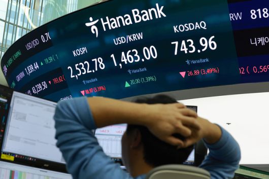 코스피 3.4% 급락 마감하며 2,530대 후퇴 (서울=연합뉴스) 신현우 기자 = 28일 서울 중구 하나은행 본점 딜링룸에서 딜러들이 업무를 보고 있다. 이날 코스피는 전 거래일보다 88.97p(3.39%) 내린 2,532.78로 마감했다. 원/달러 환율은 20.4원 오른 1,463.4원, 코스닥지수는 26.89p(3.49%) 내린 743.96으로 장을 마쳤다. 2025.2.28 nowwego@yna.co.kr (끝) <저작권자(c) 연합뉴스, 무단 전재-재배포, AI 학습 및 활용 금지> |
